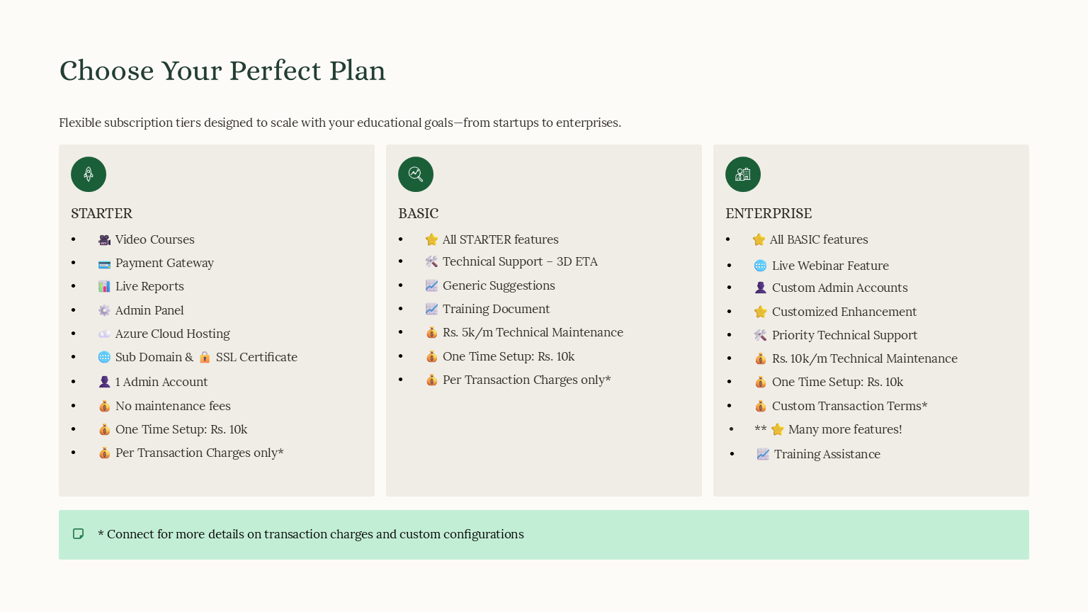 Choose the plan that best fits your needs and unlock the full potential of online learning with Georgin LMS. We offer flexible options to cater to individuals, educational institutions, and businesses of all sizes.
